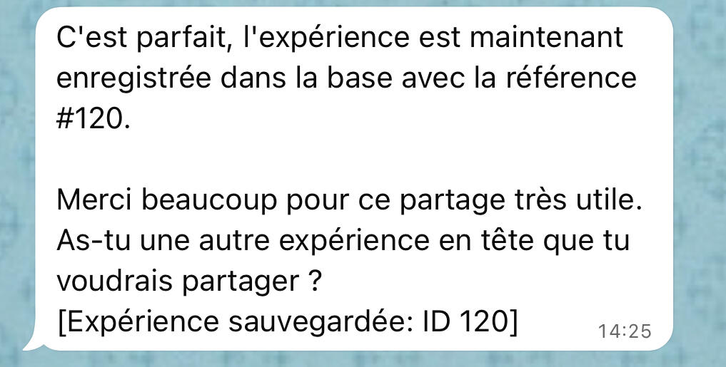 Tous les matins Madeleine envoie un message aux BMs et DAs et les debrief sur une expérience précise. Après 3 minutes d'échanges, l'expérience est enregistrée et devient immédiatement accessible à toute l'agence via Madeleine.