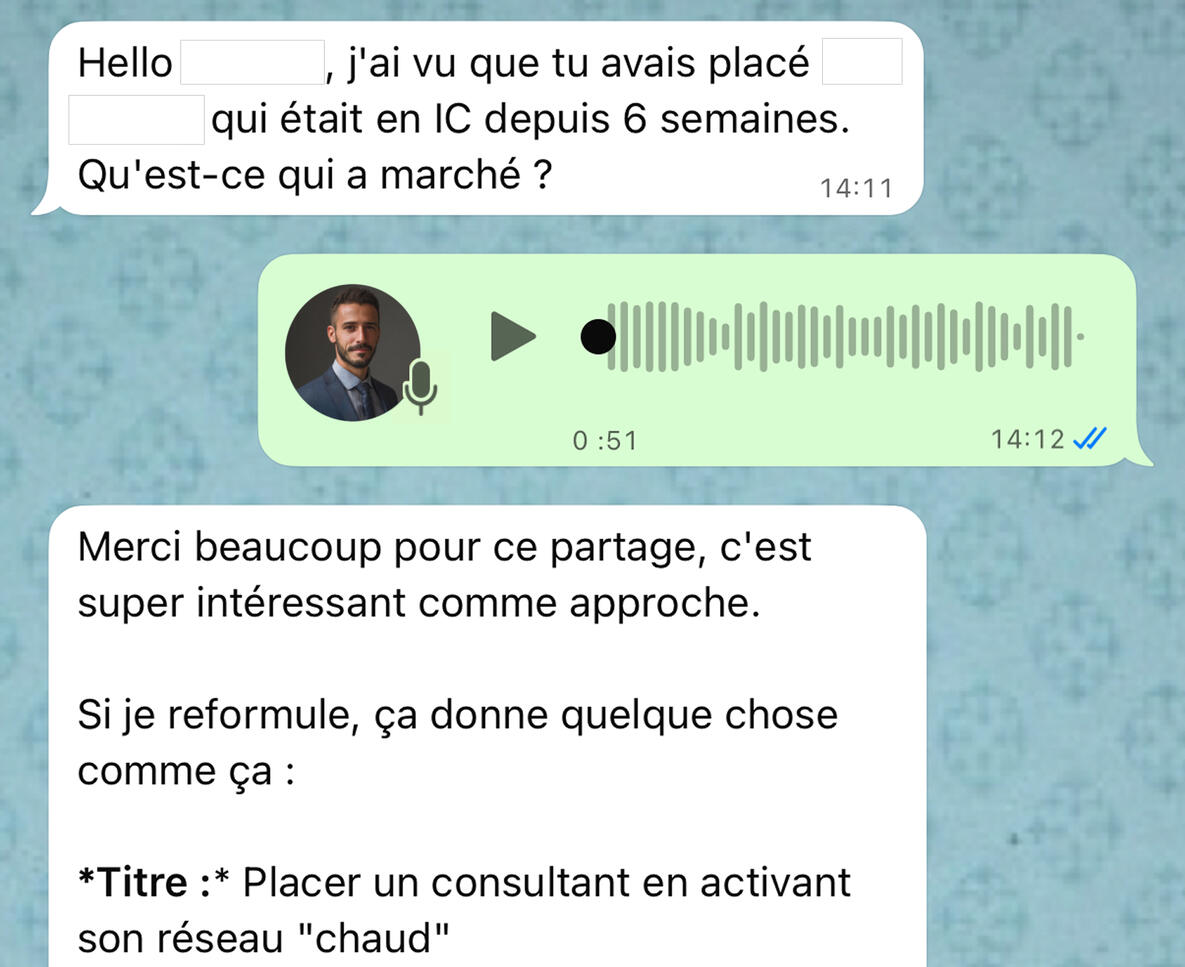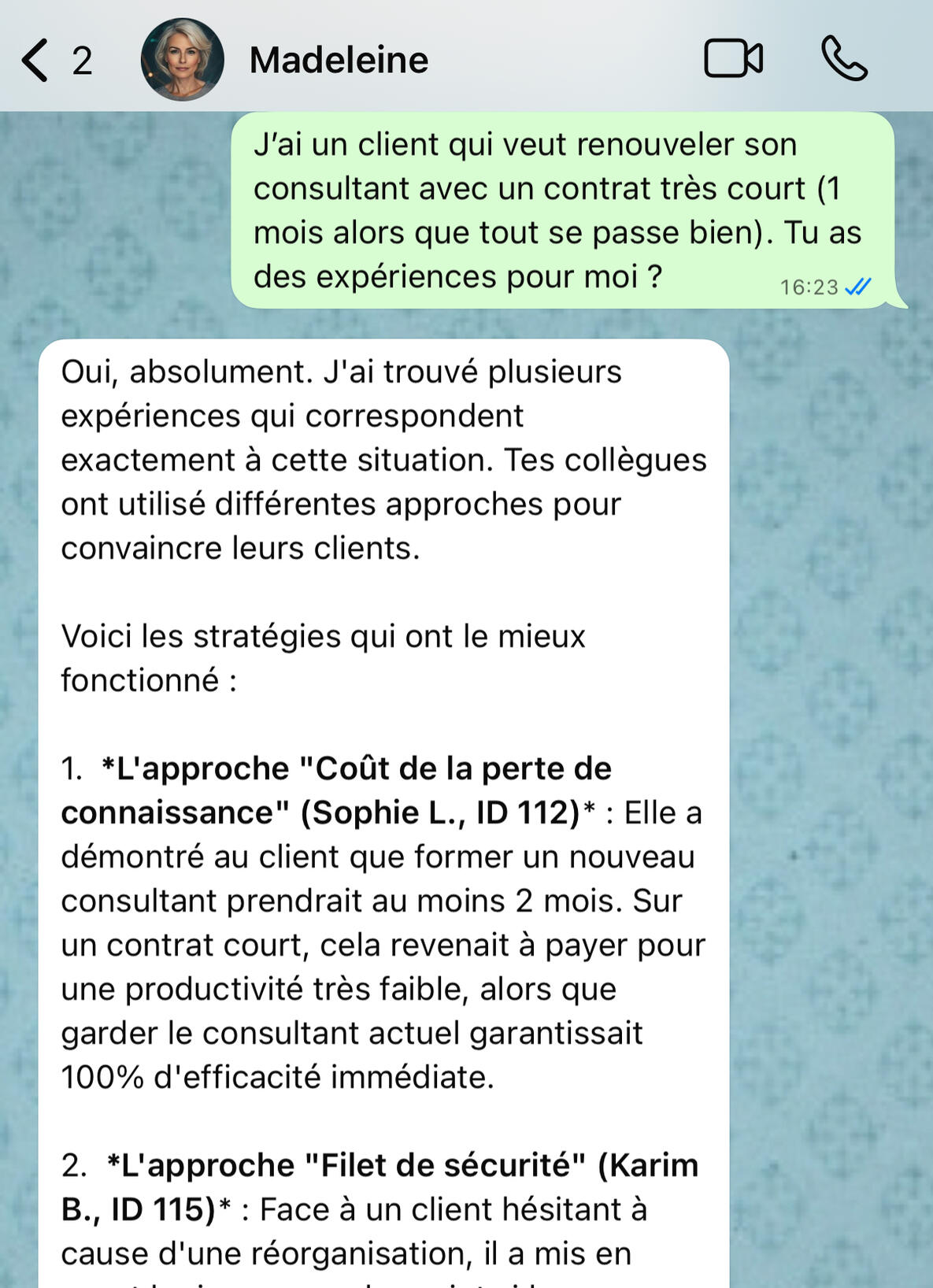 Avant de créer Madeleine, j'ai accompagné une dizaine de sociétés de conseil en ingénierie (Akkodis, Kali Group, Vacoa...) sur leur stratégie. J'ai même travaillé avec Dominique Cerutti, l'ancien patron d'Altran.Et donc quand j'ai fondé Madeleine en 2024, votre métier a été mon premier terrain de jeu.Pendant 6 mois, j'ai littéralement joué le rôle de l'agent IA moi-même : plus de 100 rendez-vous avec des business managers où je capturais leurs expériences, je les structurais, et je les transmettais aux autres équipes. En temps réel. À la main d'abord puis par WhatsApp ensuite.Résultat : des milliers de messages échangés et de questions posées par des BM.J'ai vu les galères d'ICs, les sessions de cold call qu'on retarde, les renouvellements de 30 jours, les TJMs qu'on n'ose pas remonter alors que les consultants demandent 10% d'augmentation.Madeleine a été conçue pour répondre à ces problèmes et ça se voit.